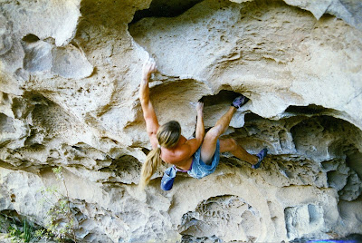 A half hour east of El Paso exists a pile of brown rocks called Hueco Tanks. For years Hueco was a destination spot for the world's best boulderers. The attraction, because let's face it, nobody vacations in El Paso, was the quality and volume of over-hung, gymnastic climbing. A perfect illustration of this type of climbing is Starpower (above), a 35 foot jungle gym during which the climber isn't ever more than 6 feet off the ground.